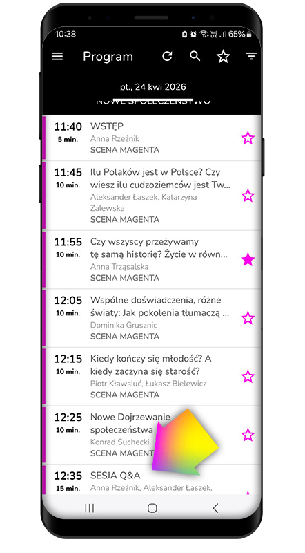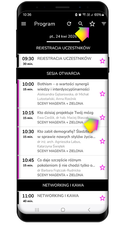 Przeglądając program możesz zaznaczyć wybrane przez siebie wystąpienia jako ulubione, a następnie wyświetlić je korzystając z przycisku filtru „gwiazdka”. Możesz także wyświetlić tylko wybrane sesje korzystając z przycisku „lejka”.
