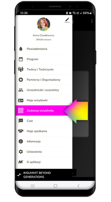 Wczytaj udostępnianą wizytówkę (kod QR) przy pomocy skanera wbudowanego w aplikację w pozycji „Zeskanuj wizytówkę”