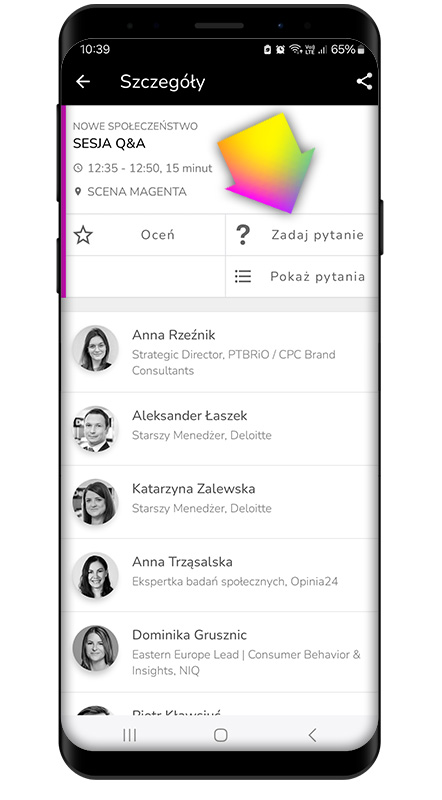 W sesjach, które kończą się sesją Q&A, możesz zadawać pytania w aplikacji